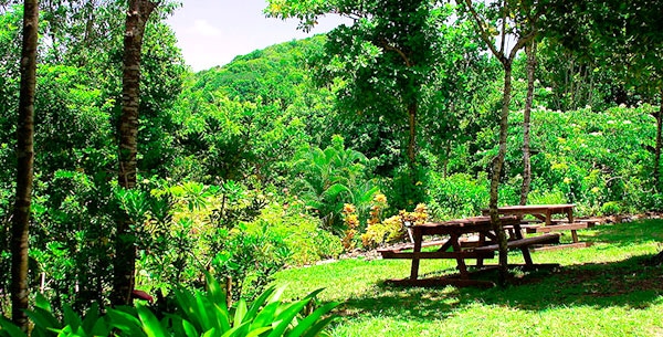 Lush tropical garden filled with blooming flowers, fruit trees, and herb patches so tranquil you'll never want to leave, and a beautiful waterfall to swim in.